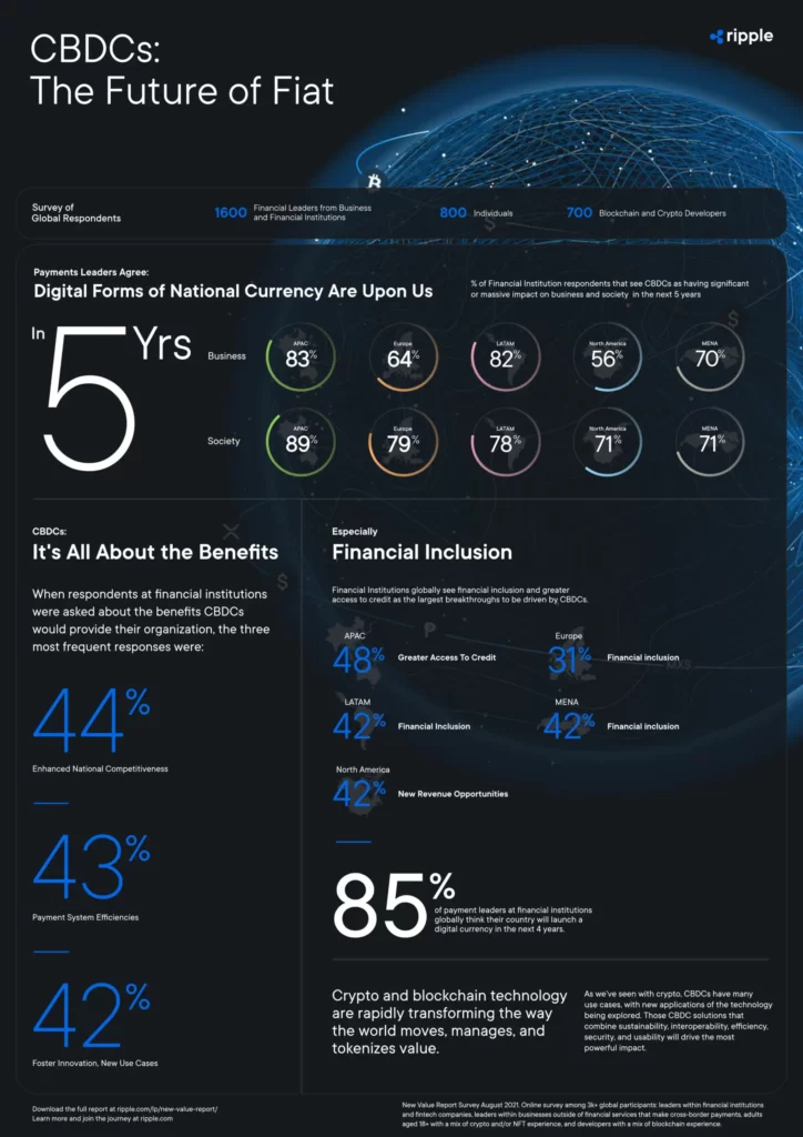 A visualization from Ripple’s New Value Report suggests the potential for central bank digital currencies (CBDCs) has generated an overwhelming consensus among financial institutions.
